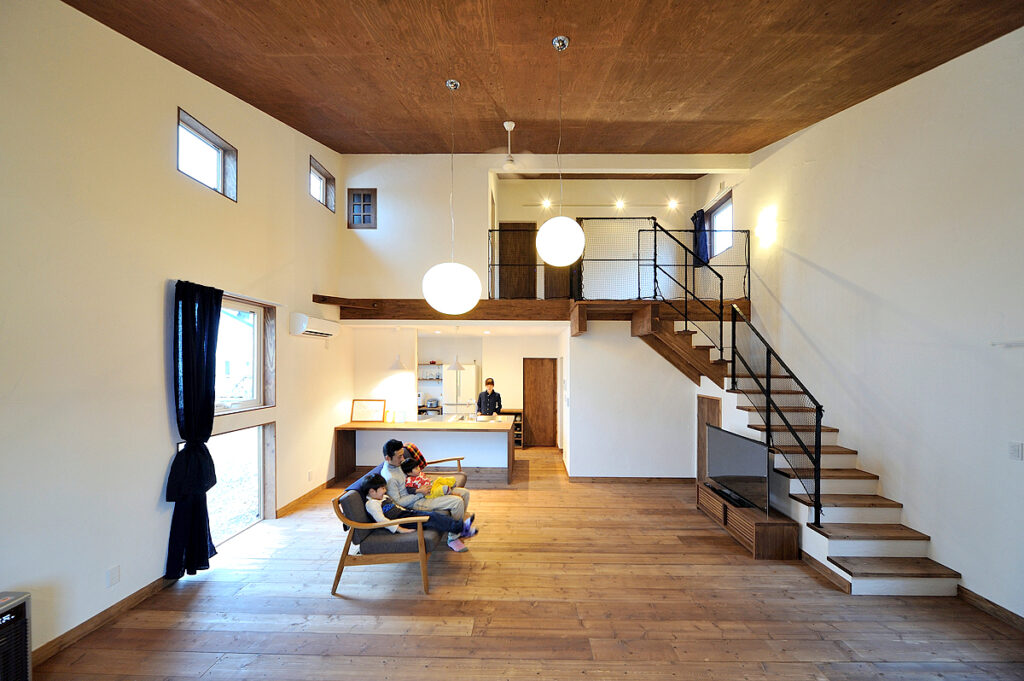 伸びやかな吹抜のLDK。家族が過ごすLDKを広くとっており、居室はキッチン横に主寝室、オープン階段を上がった先に、子ども部屋を二部屋用意しています。