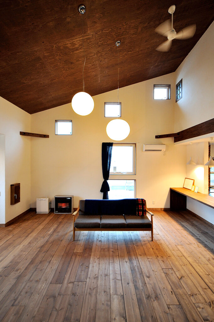 無垢フローリングに珪藻土入りのぬり壁、針葉樹合板をブラウンに塗装した天井と、自然素材を生かしたシンプルで素朴なスタイルです。