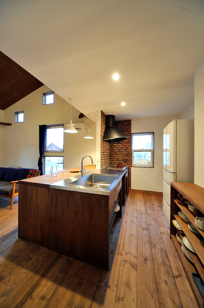 造作の対面キッチン。オープン・シェルフの背面収納は出し入れが楽ちんです。コンロまわりにあしらったレンガの風合いがブラウンに塗装した無垢床とマッチしています。