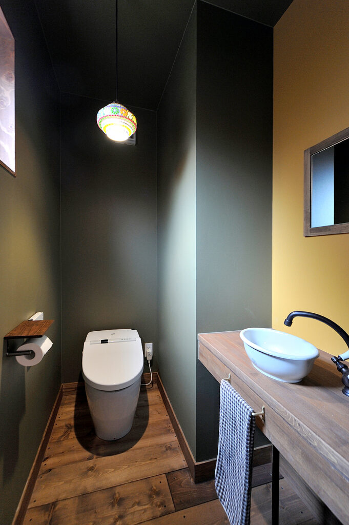 2色のクロスを使ったトイレ。男性が多いTさまご家族。どの空間も甘さを抑えたインテリアで統一しました。