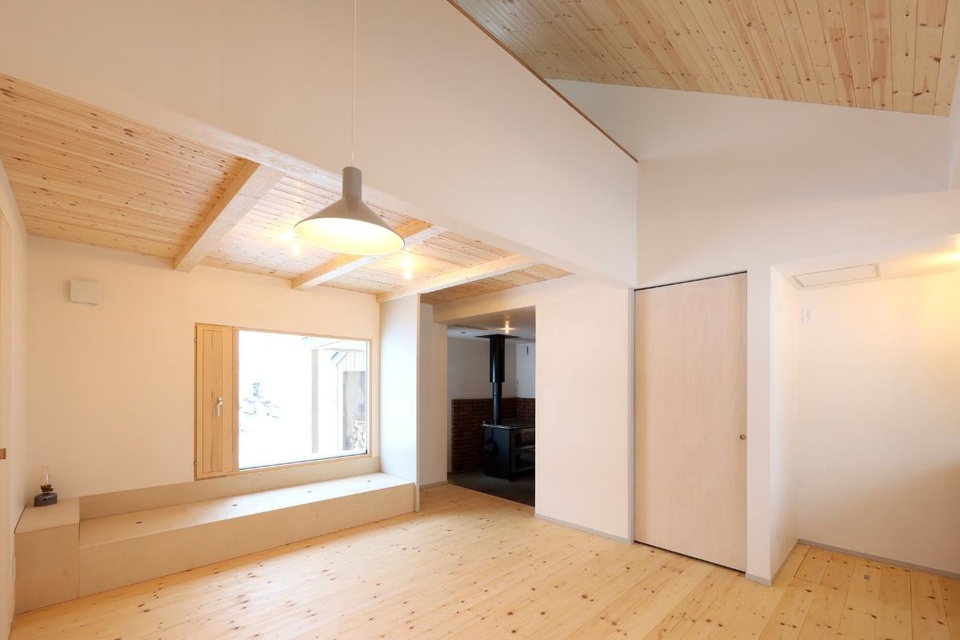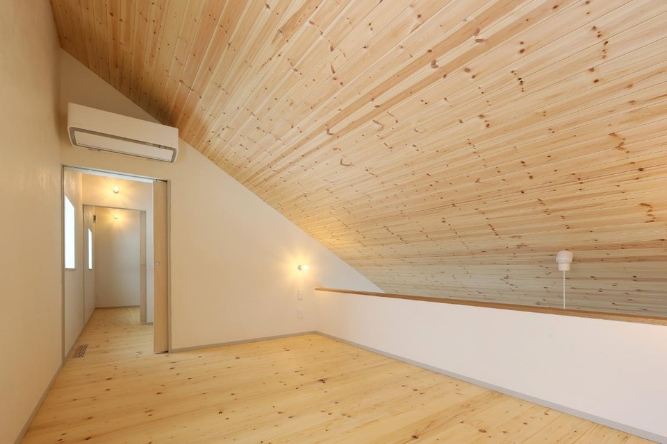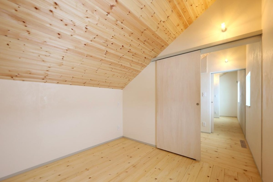 片流れ屋根なので、2階の居室は天井が屋根なりに傾斜になっています。床材と同じくトドマツの板張りで、屋根裏部屋の楽しさを感じます。針葉樹の床材は柔らかく、足裏の感触が心地よいのが特徴です。