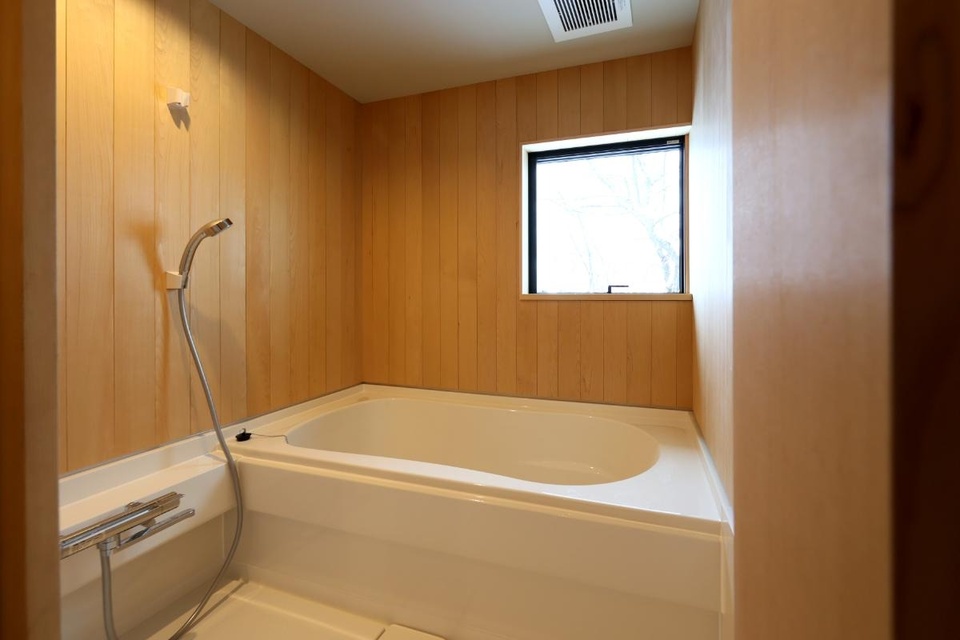 浴室の下半分は既製品のユニットバス(ハーフユニット)で、壁や扉、天井などは大工さんの造作です。自然素材をふんだんに使った家でも、お風呂は工業製品という家が大半ですが、萬田さん宅のお風呂は壁にヒバを採用しており、木の香りでほっとする空間に。自然素材だと掃除が大変そうですが、同じようにヒバを採用した清水さんのご自宅も「塗料を5年に一回くらい塗れば黒カビの発生を抑えられます」とのことでした。