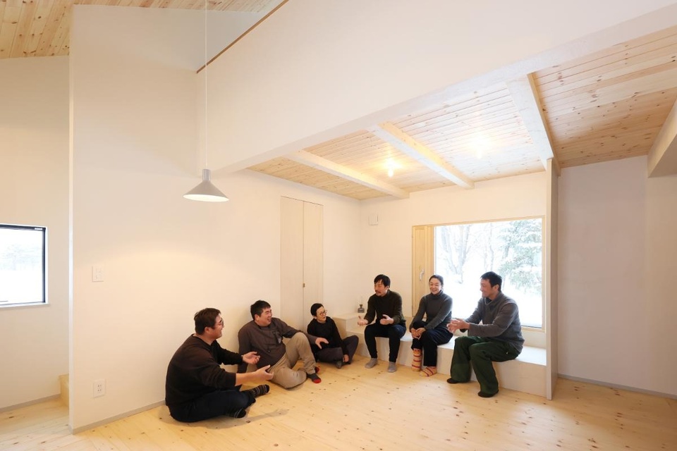 1階に戻ると、オーナーさんと設計者、家具職人、施工会社の皆さんが勢ぞろい。萬田さん夫婦が東川町に移住する前からプライベートで繋がっていた間柄です。家、釣り、スキーの話などで盛り上がっていました。